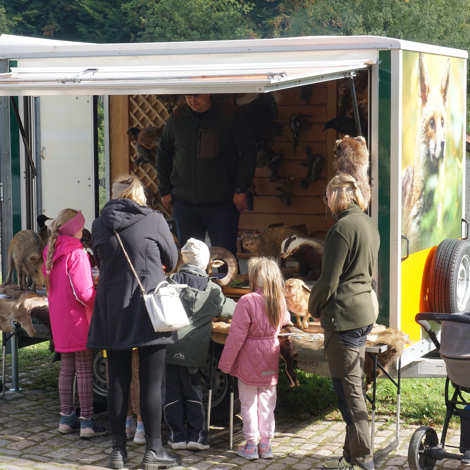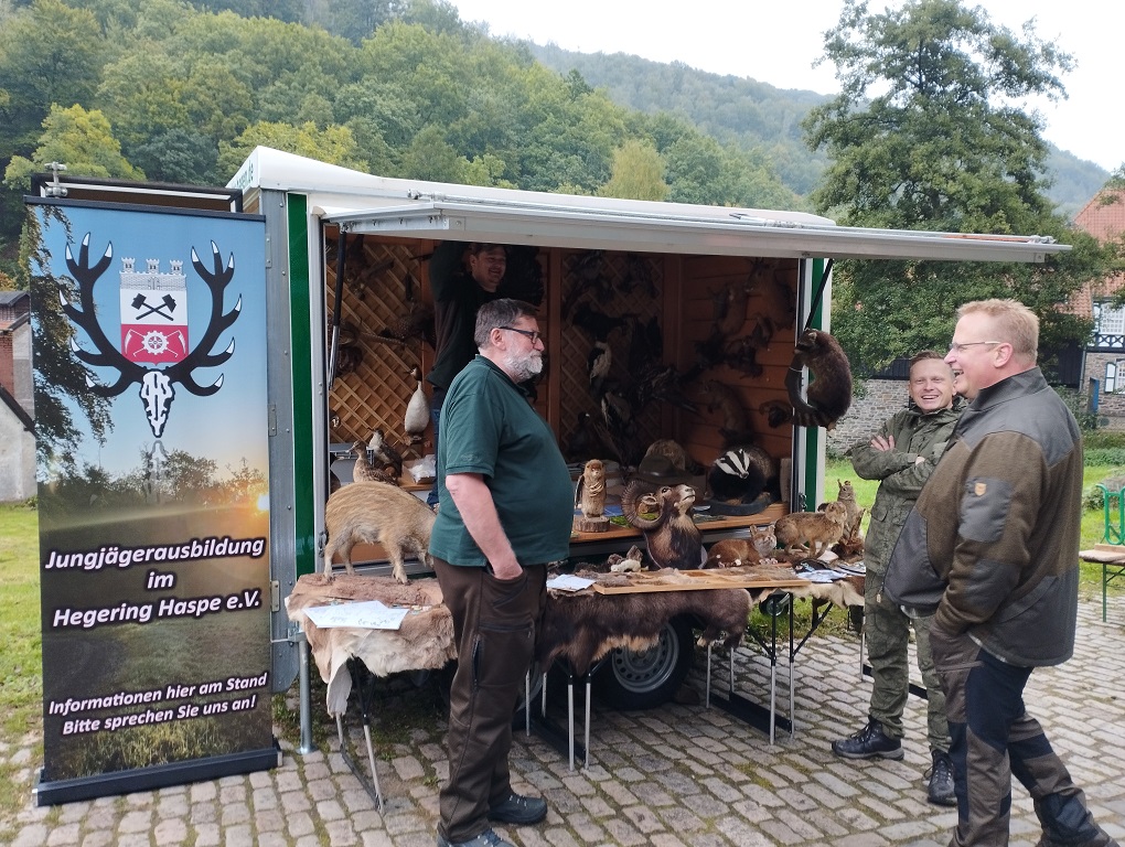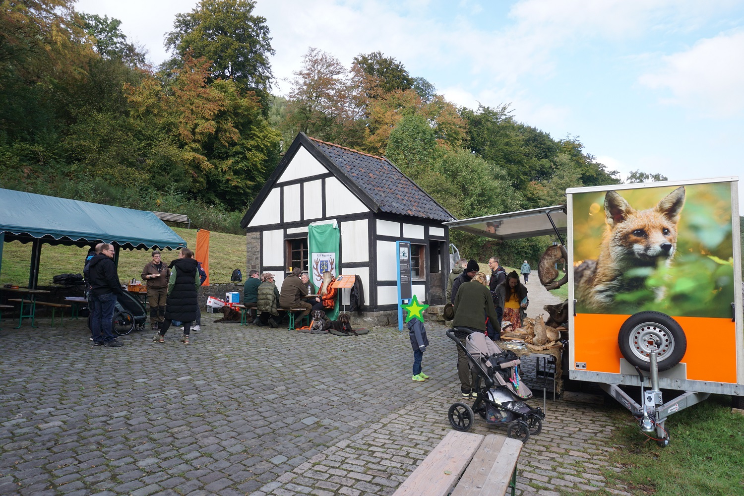 Nach kurzer Zeit waren sowohl die rollende Waldschule, als auch die Informationsstände der anderen Hagener Hegeringe und der Kreisjägerschaft Hagen aufgebaut. Gegen 11 Uhr trafen dann auch die ersten Besucher bei uns ein, erst nur ein paar vereinzelte Frühaufsteher, im Laufe des Tages dann aber ein nicht endender Strom an Interessierten. Und mit Ihnen kam das gute Wetter.