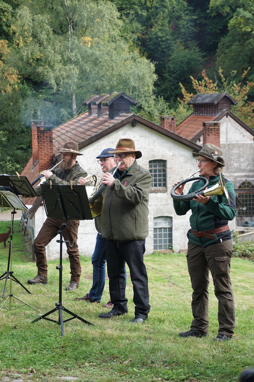 Neben der rollenden Waldschule spielten am frühen Nachmittag die Jagdhornbläser des Hegerings Dahl auf. Die verschiedenen Jagdsignale klangen bald darauf durchs Mäckinger Bachtal und eine Traube von Menschen versammelte sich, um auch den wichtigen Aspekt des jagdlichen Brauchtums mitzuerleben.